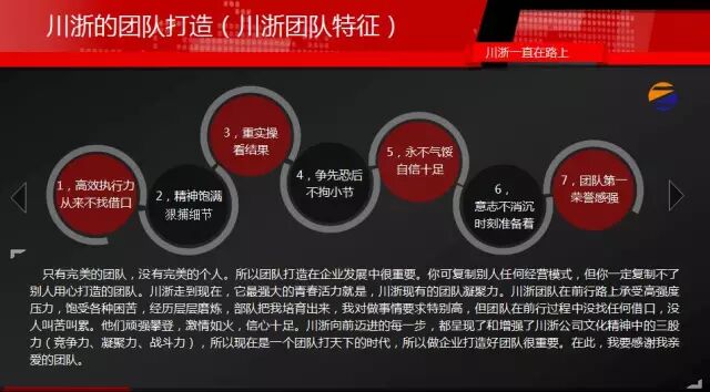 只有完美的团队,没有完美的个人。所以团队打造在企业发展中很重要。你可复制别人任何经营模式,但你一定复制不了别人用心打造的团队。川浙走到现在,它最强大的青春活力就是,川浙现有的团队凝聚力。川浙团队在前行路上承受高强度压力,饱受各种困苦,经历层层磨炼,川浙人做事情要求特别高,但团队在前行过程中没找任何借口,没人叫苦叫累。他们顽强攀登,激情如火,信心十足。川浙向前迈进的每一步,都呈现了和增强了川浙公司文化精神中的三股力(竞争力、凝聚力、战斗力)。