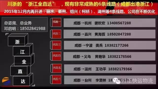川浙的 “浙江全直达” ,现有非常成熟的6条线路,2015年估测月均发车量260挂(全为成都出港浙江)。2015年9月开始,日均发车量10挂。9月最高日发车纪录15挂。保持2015年3月往后每个月发车量和营业额都刷新纪录。2015年12月内再开通:丽水、衢州、绍兴(柯桥)、湖州4条直达线路。公司在前进的过程遇到的问题在不断优化中.....感谢新老客户及物流友人的理解和大力支持!有您们这样的支持,才有川浙的今天和更好的明天!川浙一直在路上,一直在奋进,一直在想为您做的更多更好~!祝大家中秋国庆开心快乐!